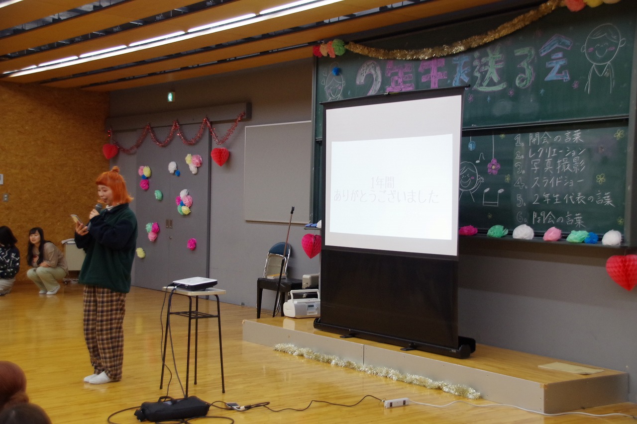 1月16日(木)女子短期大学部学友会主催の「2年生を送る会」が行われました。1年生が心を込めて企画した楽しいレクリエーションのゲームや先生方からのビデオレター、思い出のスライドショーなど、楽しいプログラムが続く中、2年生も卒業の実感が少しずつわいて来たようです。