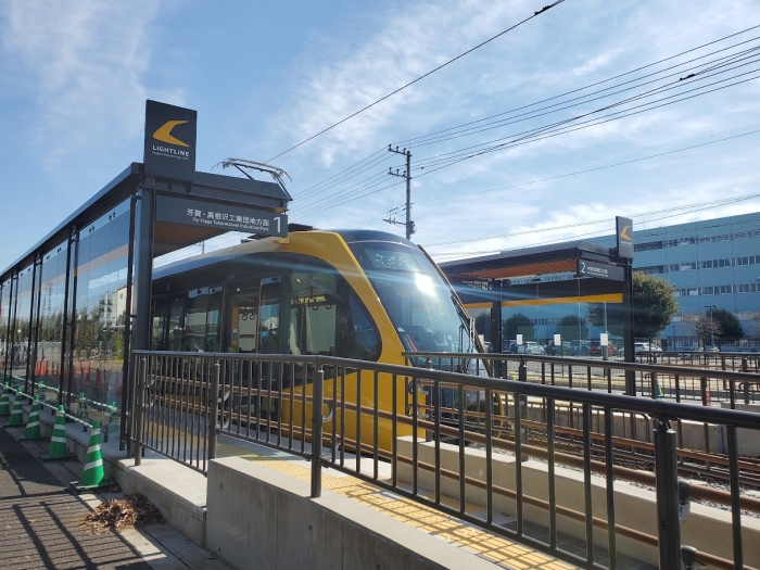3月1日、初めて鬼怒川を超え清陵高校前(作新大・作新短大前)にLRTが停車しました。右後方に本学の第3教育棟が写っています。