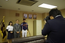 - 【軟式野球部】全日本代表の石井選手と八木マネージャーが渡邊学長に大会の報告